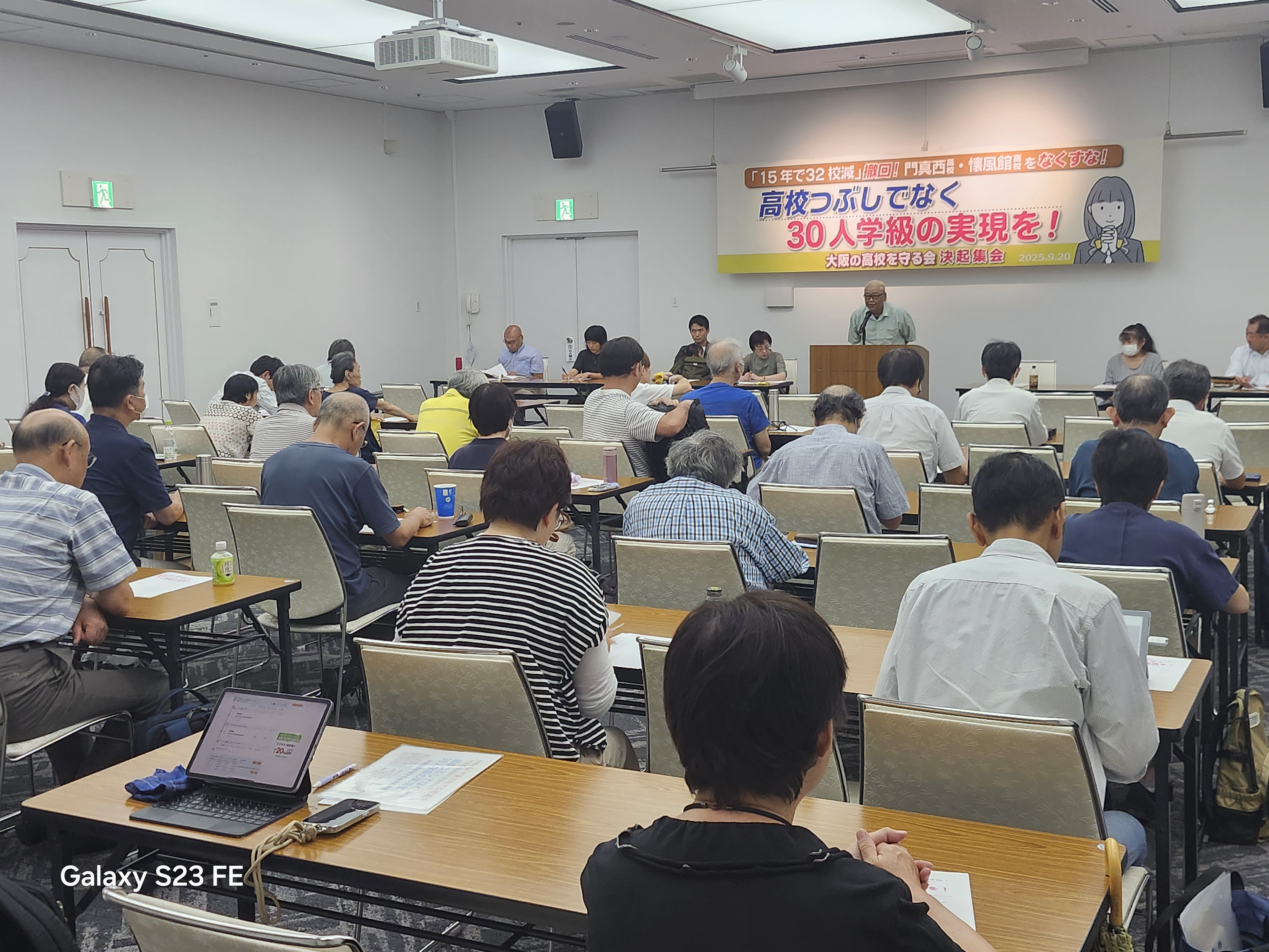 大阪の高校を守る会は、9月20日(土)大阪市内の府教育会館で、「『15年で32校削減』撤回!門真西高校・懐風館高校なくすな!高校つぶしでなく30人学級の実現を!大阪の高校を守る会決起集会」を開催し、48名が参加しました。集会では、開会あいさつ、全体報告につづいて、当該校の教職員、地元の義務制教職員組合、地域住民などから意見表明があり、門真西高校、懐風館高校がなくしてはならない大切な役割を果たしていることが明らかにされました。また、私学の教職員組合の代表や、府議会から日本共産党の石川たえ議員、民主ネットの山田けんた議員が挨拶に立ち、理不尽な高校つぶしではなく、教育条件の改善こそ必要と訴えました。集会後は会場近くで街頭宣伝をおこない、署名への協力を訴えました。