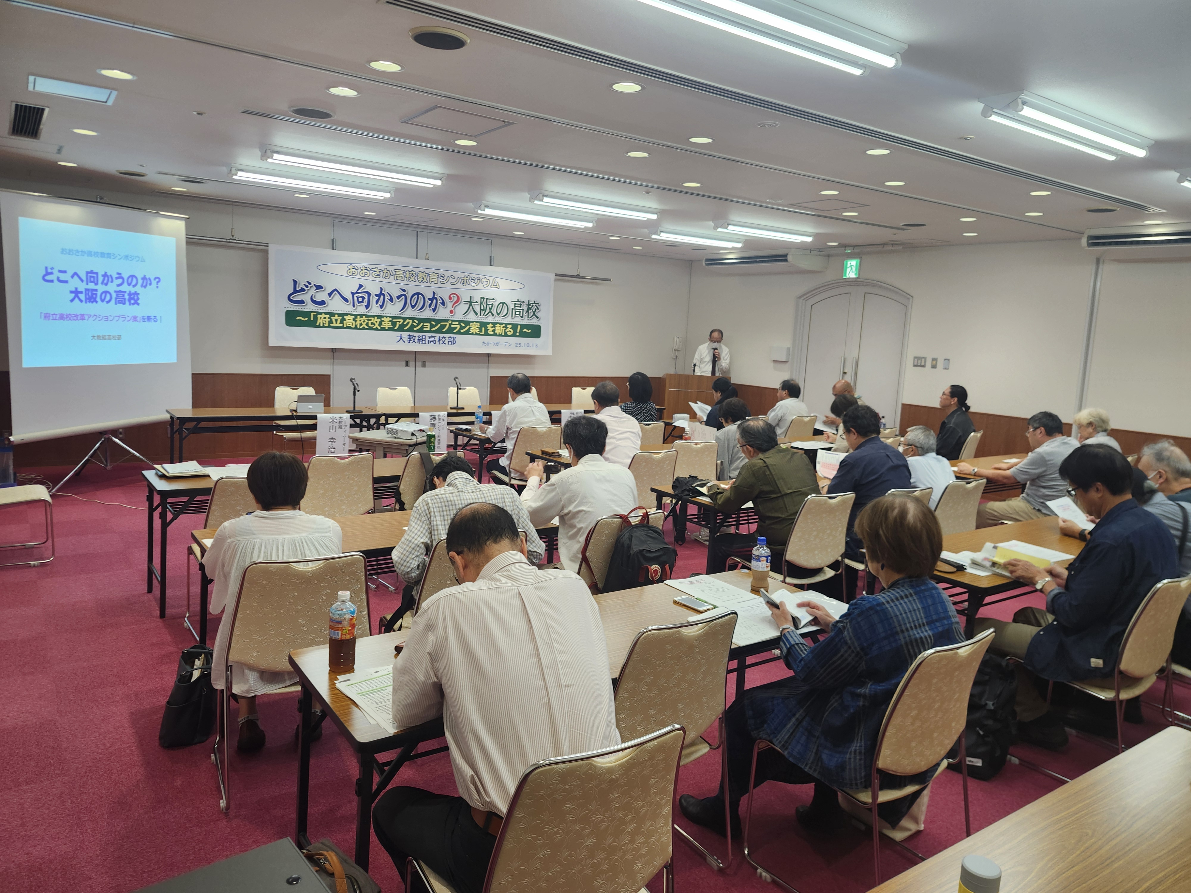 10月13日(月/祝)に大阪府教育会館で、大教組高校部主催の「おおさか高校教育シンポジウム」が開催され、約40人が参加しました。テーマは「どこに向かうのか?大阪の高校―府立高改革アクションプラン案を斬る!」で、アクションプラン案の概要についての基調報告に続いて、パネルディスカッションがおこなわれました。パネラーは、アクションプランの改編対象校である大阪教育センター附属高校、大阪わかば高校の現場教職員、府高教、大私教の役員の4人で、コーディネーターは大教組の書記長がつとめました。
