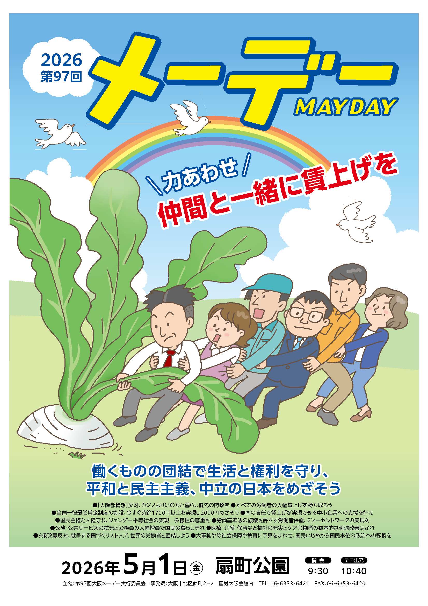 5月1日に扇町公園で第97回大阪メーデーが、「働くものの団結で生活と権利を守り、平和と民主主義、中立の日本をめざそう」をメイン・スローガンに開催されます。 開催日 2026年5月1日(金) 会場 扇町公園 開会9:30 ・JR天満下車または、大阪メトロ扇町駅下車 また、堺など府内15カ所でも地域メーデーが開催されます。